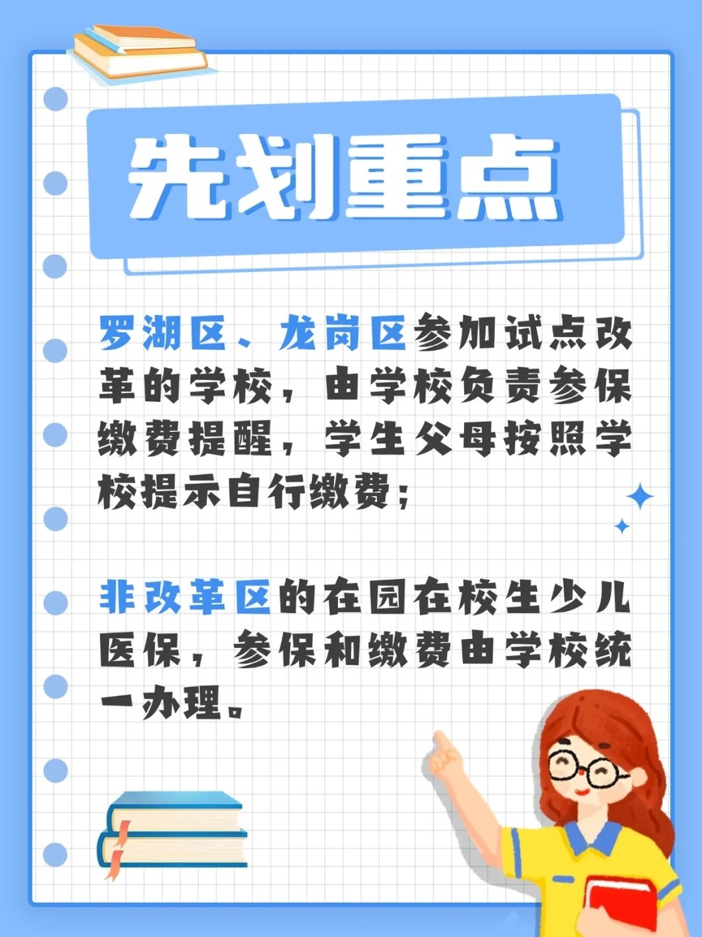 3.2024-2025學(xué)年度,羅湖區(qū)、龍崗區(qū)試點改革(采用“直征入庫”方式),參加試點改革的學(xué)校,由學(xué)校負責(zé)參保繳費提醒,學(xué)生父母按照學(xué)校提示自行繳費。